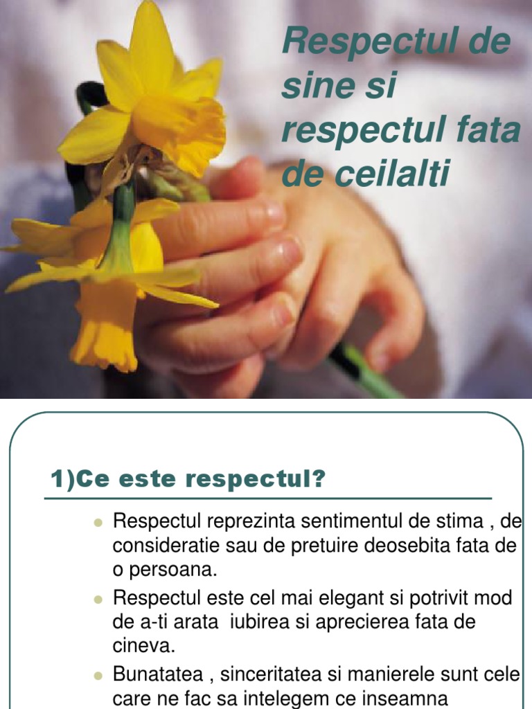 Daca te simti bine cu tine insati insuti numai cand ai bani in buzunar cand arati ca o vedeta cand ai o masina noua sau o casa cu etaj. Felul de a fi al cuiva se cunoaste dupa cum. Este valoarea pe care o recunoaștem la cineva sau la propria persoană sau o oferim cuiva sau nouă înșine. Respectul reprezintă atitudinea sau sentimentul de apreciere stimă și considerație față de o persoană o idee sau o instituție.
